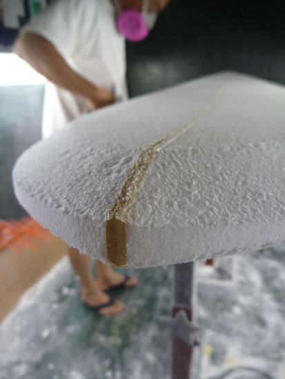 シェイプされたボードはガラスクロスと樹脂でラミネートしてフィンを取り付けます。