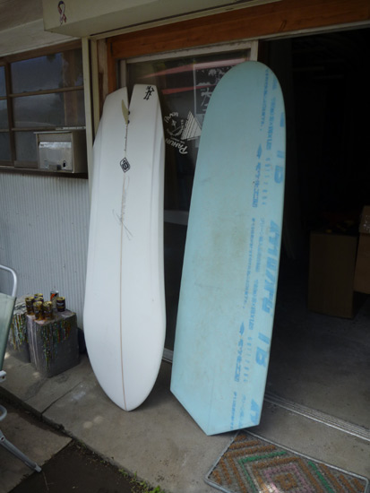木曜は定休日。店はやってませんが仕事はしております。リペアボードのチェックとカツさんのシェイプルーム訪問です。