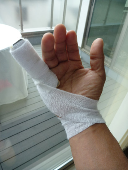 救急病院で応急処置。明日地元の専門医に診ていただきますが、小指と薬指ヤバイです。さて、どーなる!?