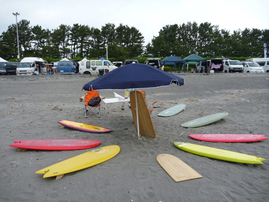 自宅から約3時間のドライブで静波海岸へ到着。出展ブースはほぼ満杯ですが、KATSUブース出展予定地は広いビーチの真ん中。慌てず目印のテントを立てて、ボードを並べます。