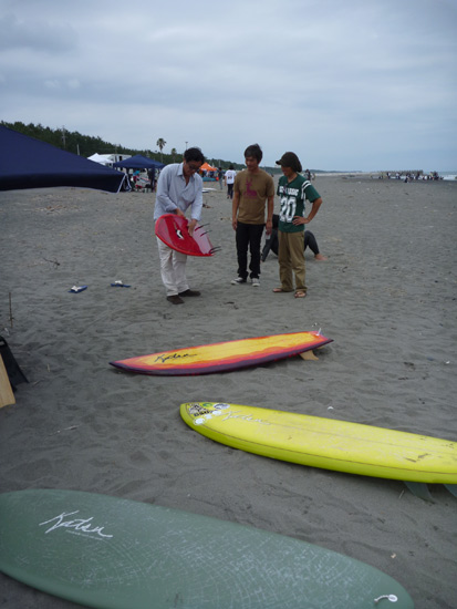波はいまひとつでしたが、たくさんの人にブースを訪れていただいて、カツさんとお話をしながら積極的に試乗していたのが印象的でした。ボードの貸出記録を見ると、ご住所は関東、関西、東海、東北、信越地方。みなさま遠いところを本当にどうもありがとうございました。