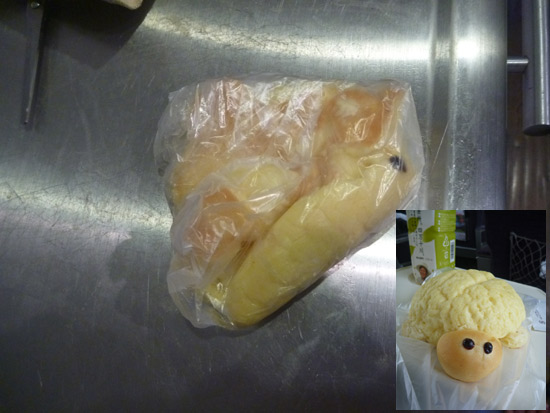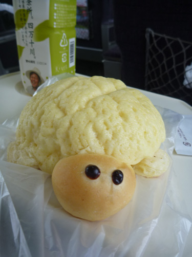 朝ごはんは小田急線の車内で…。サンドウィッチと一緒に買った「ウミガメパン」は午後のおやつ。