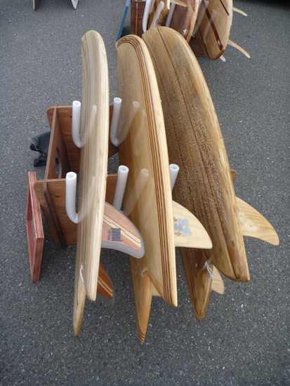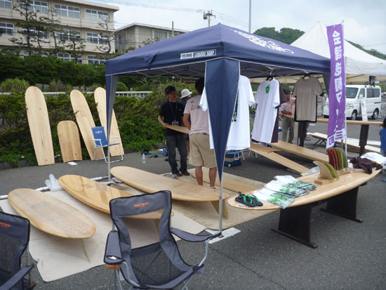今回のイベンター、グレミーサーフクラブのブース。美しいウッドボードが並んでいます。
