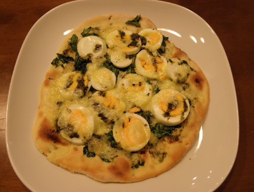 そして最後、三枚目。どうしようか迷った上に作ったのがこれ。バジルペストを塗ってその上にシャンツアイ、そしてゆで卵とチーズを乗せてみました。不思議な味でしたが結構いけました。