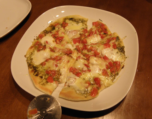 二枚目。トマト、モツアレラチーズ、バジルペスト。トマトは生のトマトをざくざく切っただけです。味はあっさり目。