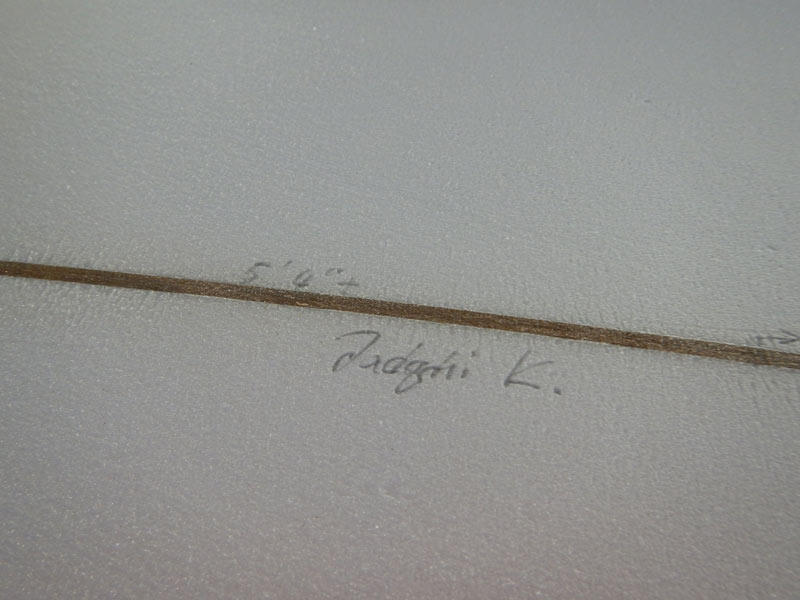 答えは「ハンドシェイプのボードなので分かりません」です。他のことなら大抵はお答えできますが、こればかりは全く想像もつきません。ボードのリッター数は、コンピューターで管理されたシェイプマシンのシェイプじゃないと分かりません。
