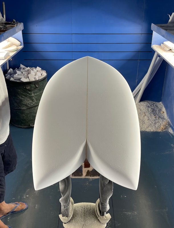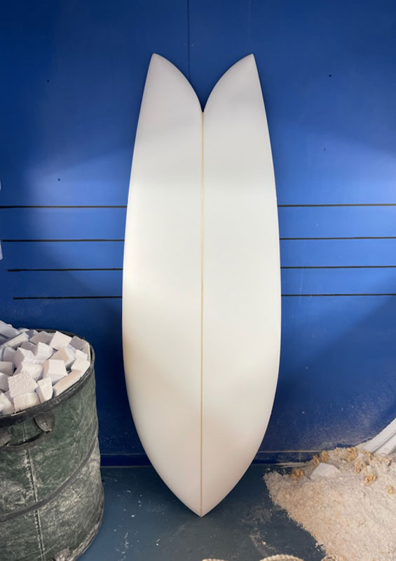 5'4"FISH。ニーボードとしてシェイプしたフィッシュです。この魚のかたちをしたサーフボードはもともとはニーボード、つまりヒザ立ちで乗るための道具として生まれて来ました。