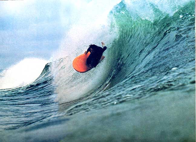 初めは木製のパイポ。それから折れたロングボードのブランクスを使って作られましたが、この辺は川南正さんのニーボードの始まりと同じです。形は足に履いたフィンがはみ出さないように、幅広で、左右二つに大きく分かれたフィッシュテールが考え出されました。
