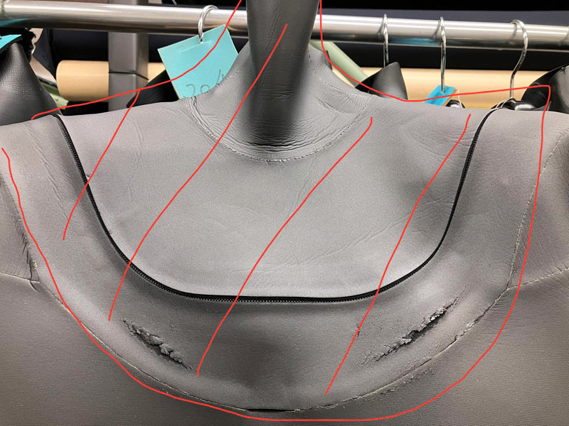 これはかなり大がかりで、胸から上のパーツの全交換(背中側も)です。この案件は現状復帰のリペアではなく、擦れに強いジャージ素材での修理をご提案させていただきました(¥33.000の10%オフ¥29.000のお見積りです)。