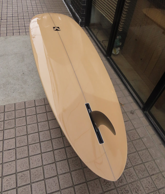 MINIモデルが入荷しました。ストックボードです。サイズは6’8”x22”x2”3/4。亜麻色のピグメントでラミネートして、クリアのデッキにはボランクロスでパッチを入れました。