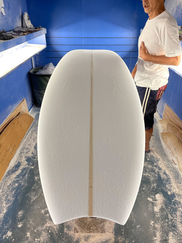 さて、この8’8”のTOTOのブランクスの発泡は一番重たい「CLASSIC」だそうです。それがリクエストだということで、そういう部分もいろいろと考えておられるのはさすがだと思いました。「最後のボードはカッチャン(活さんです)のシェイプだよ」なんて言っておられましたが、まだまだガンガン行ってください。