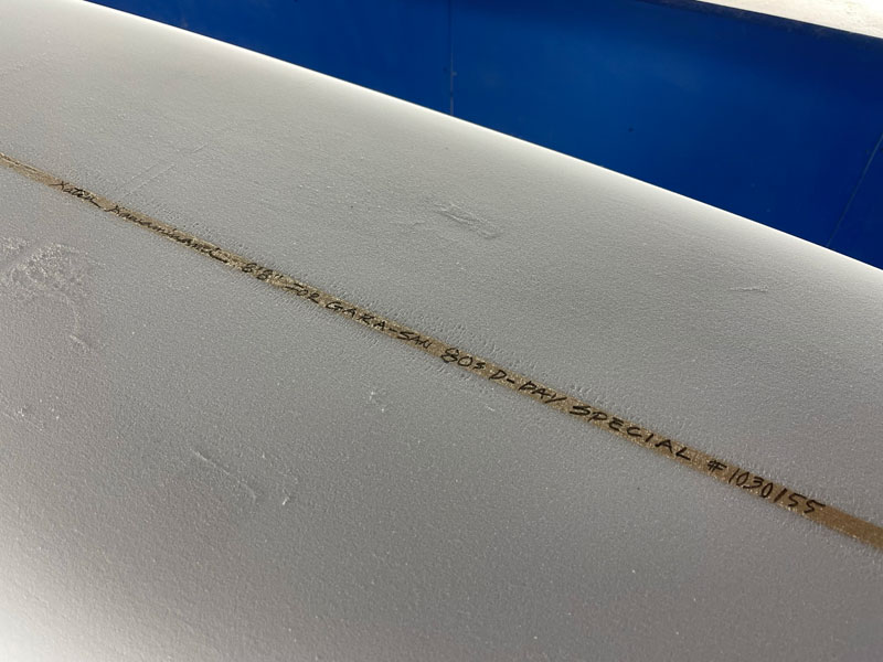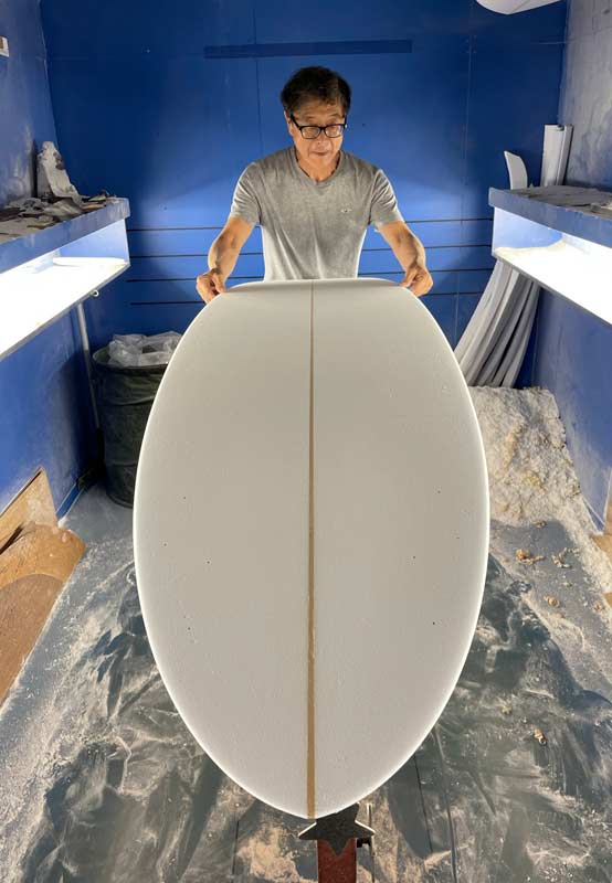 MOON TAIL TOTO 8’8”。傘寿を迎える、葉山のレジェンドサーファーへのシェイプです。先日も海でお会いしましたが、80歳とは思えない元気さで次々と波を捕まえておられました。