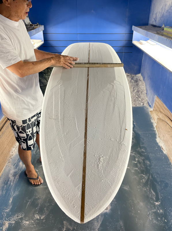 同じボードを同じサイズでシェイプしても、手作業には微妙な差が出ます。テールのラインはこちらの方が好きです(良いんじゃなくて’好き’)。活さんが何か説明してくれていますが、忘れました 笑。