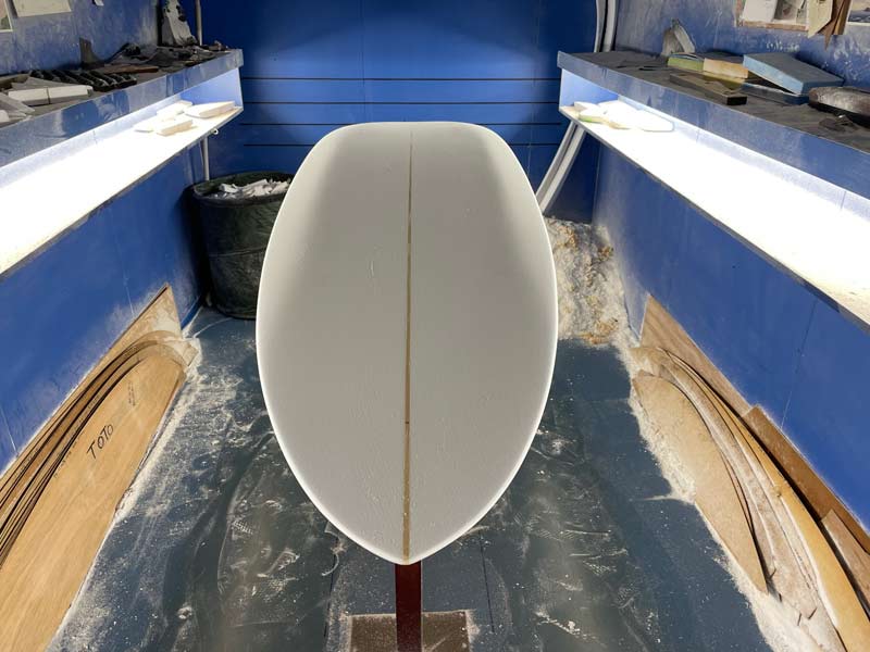 ラウンドノーズのダイアモンドテール、二本シェイプされていました。どっちにしますか?と聞かれ、5’8”のニーボードにボトムがより似ているように見える左側を選びました。もう一本もテストボードです。