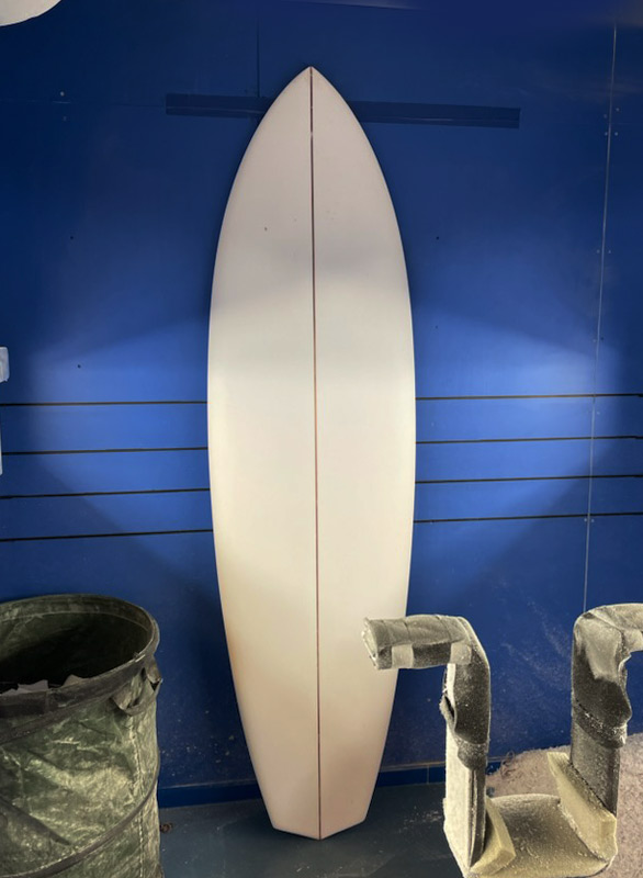 シェイプ中のダイアモンドテールのシングルフィン。レングスは6’4”。オーダーボードです。活さんが70年代のシングルフィンの時代に乗っていた’ショートボード’に、現代のシェイプデザインをプラスしたシェイプです。