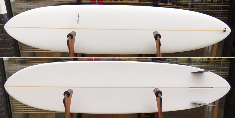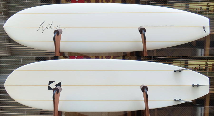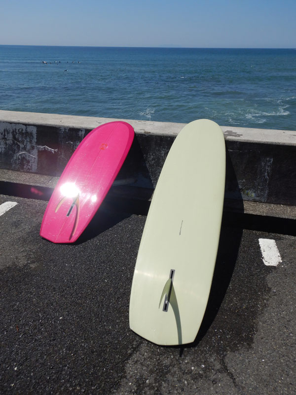 それから、もうひとつの変化です。AC SHAPEで作ってもらった8フィートのツインピン、ユーズドでお出しします。どうもやっぱりツインフィンは私には合わないみたいです。フィッシュなら普通に乗れるのに、ツインピンとなるとなぜかダメなんです。