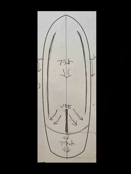 考えているのはこんな感じです。70年代のシングルフィンの時代のニーボードを見ているとこんな感じのアウトラインで、フィンBOXの後ろ辺りにステップが入ったシェイプがあります。ステップボトムです。