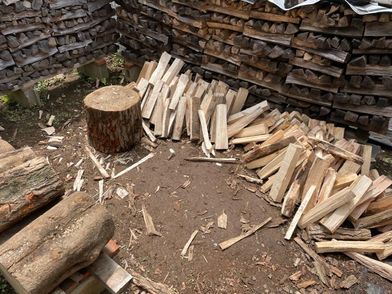 薪割りはもう15年以上やっているので慣れたものです。四角い形になるように上手く割っていくのですが、いいトレーニングにもなります。重たいものは腹筋でしっかり腰を守りつつ持ち上げます。