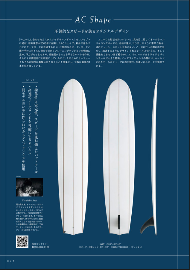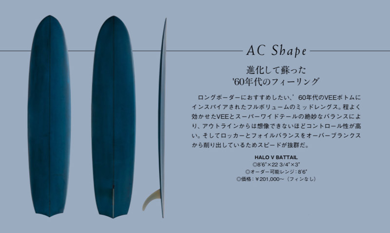 AC SHAPE、BLUEマガジンにノーズライダーとVEEボトムが紹介されています。