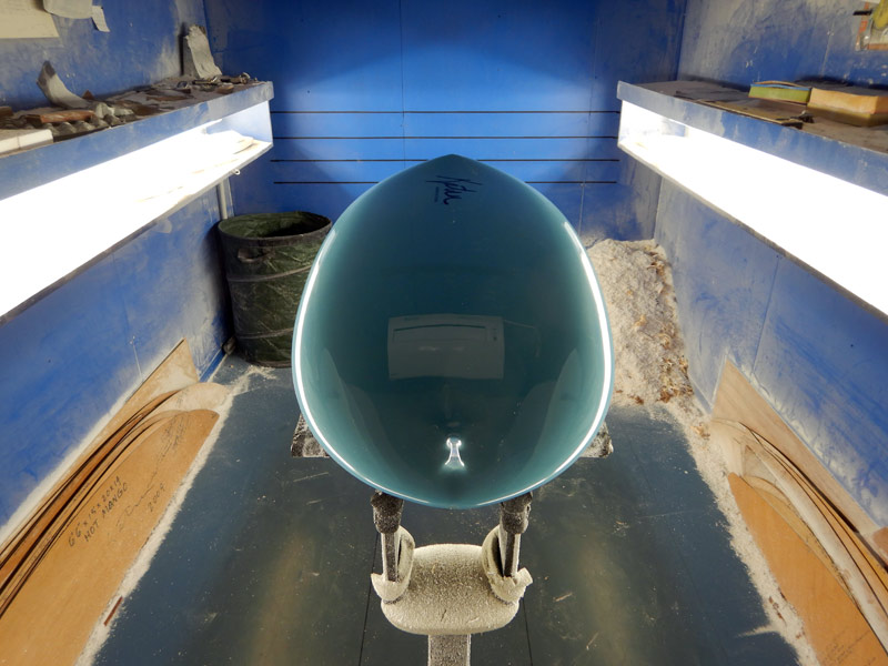 ラミネートも軽く、4オンスでラミネートしています。前から使っているラウンドテールは6オンスラミネートでしっかりとした重量があってボリュームも多めですが、それとは正反対で薄く、軽く、今までに無い感じに仕上がっています。