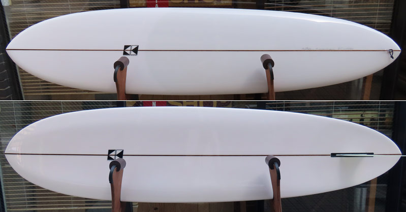 昨日がお初だった5’6”もシングルフィンです。最初に作ったシングルフィンのニーボードが少し大き過ぎたように感じたので、ノーズを絞り、レングスを2インチ短くしました。