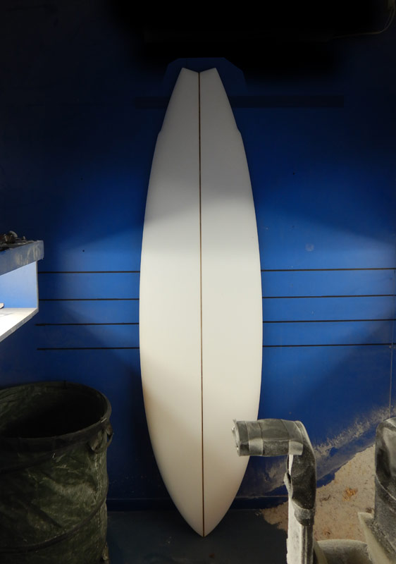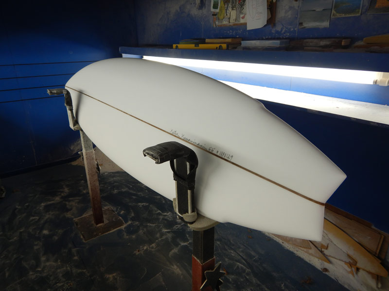 厚みは薄めで2”1/4。ロッカーはかなりフラット。試験的に使ってみたブランクスから作りました。テールにシェイプでロッカーを加えていますが、センター部分はもう一本の5’8”と比べるとかなりストレートです。