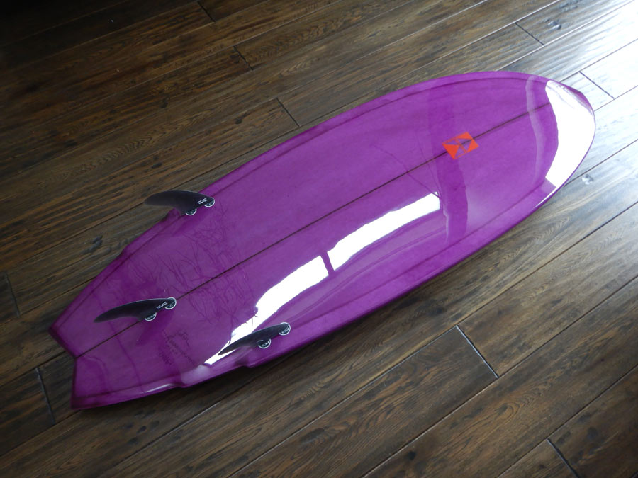このフィッシュ、プリモフィッシュをそのままツインからクアッドにしたような感じです。ボトムのシェイプはクアッドに合わせて変えています。