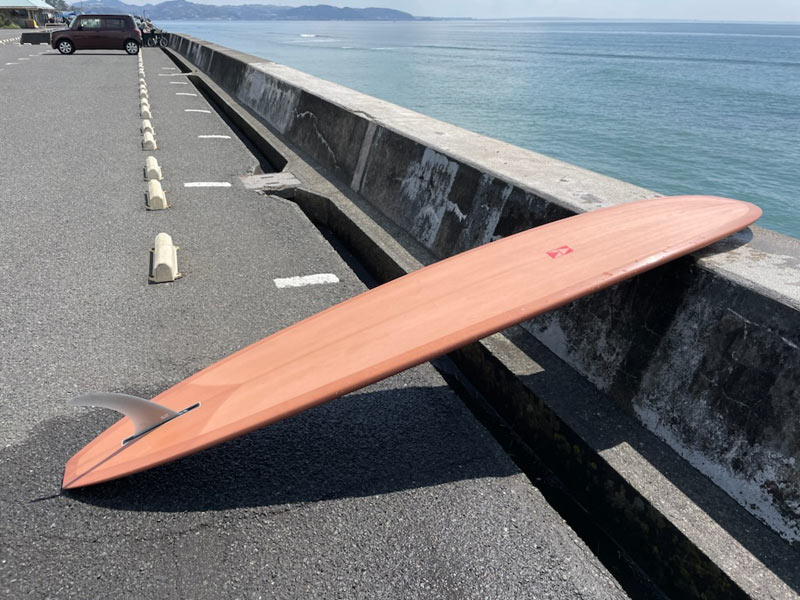 ボードはカツカワミナミサーフボードのTOTO 9’3”。ライダーのテストで実績はもうしっかりと出来ていますが、私にとっては初めて。ロッカーもシェイプも今までに経験したことがない、新しいロングボードです。