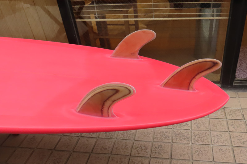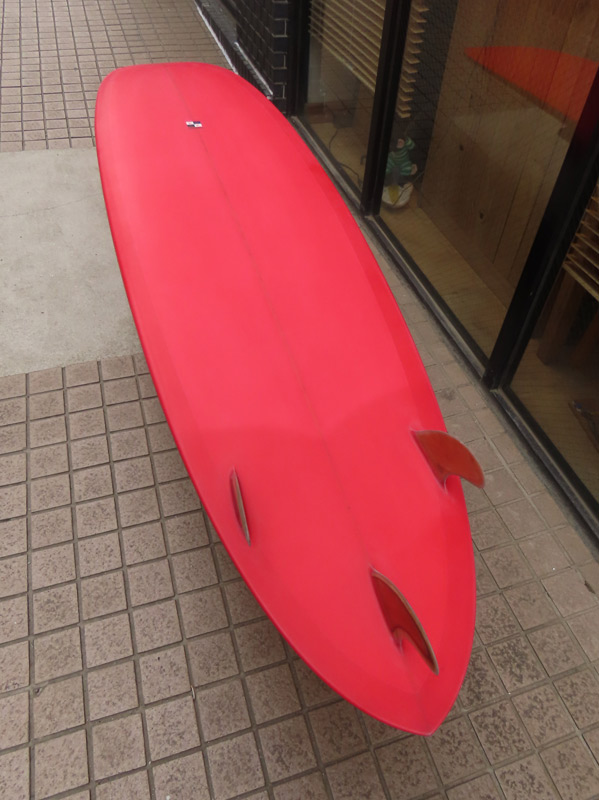 ミッドレングスのトライフィンが出来上がりました。オーダーボードです。レングスは、7’10”。明るい赤のピグメントが鮮烈です。