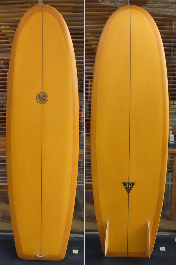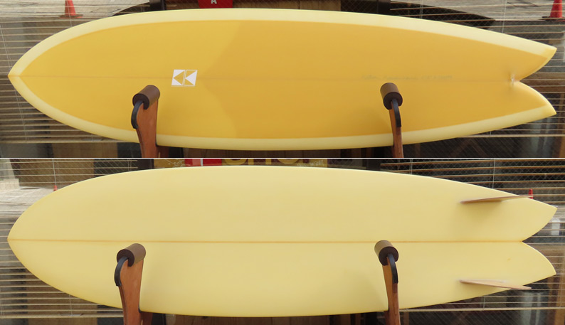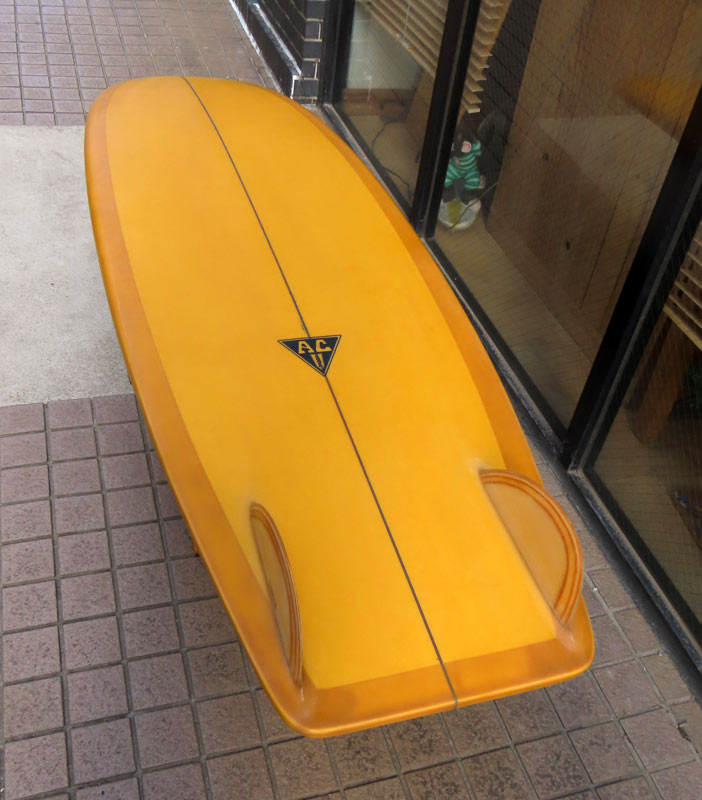カスタムオーダーのAC SHAPE、クアッドフィッシュ。レングスは6’8”。幅は22インチプラス。スモールコンディションでも十分楽しめる、浮力多めのシェイプです。