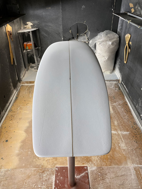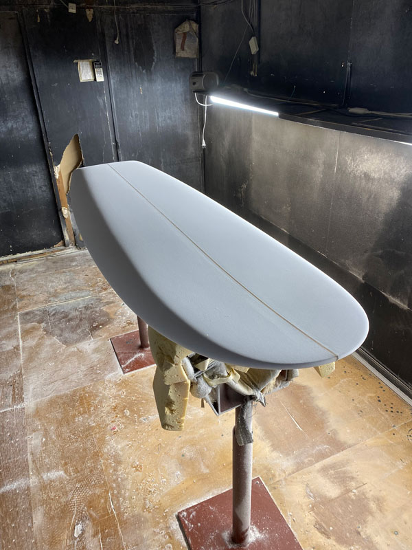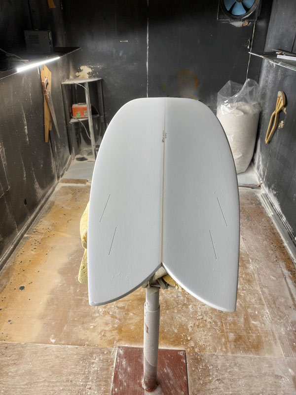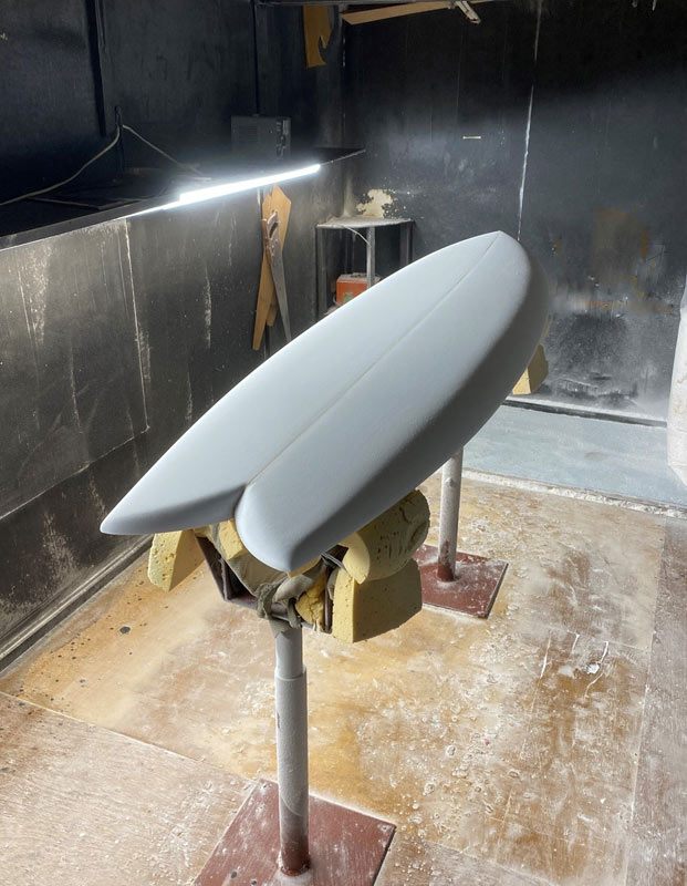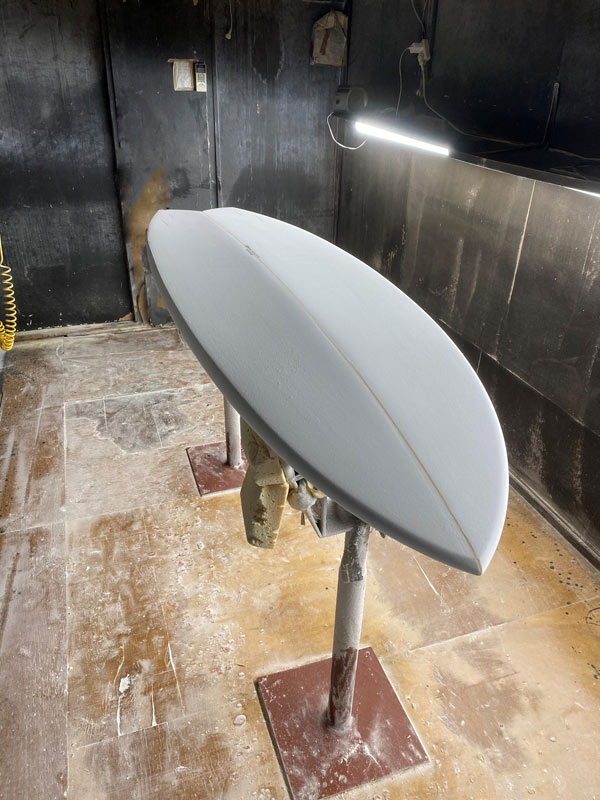 この角度と光線で見ると、ダウンレールの曲面がボード全体をきれいにまとめているのが良く分かります。活さんお得意のシェイプです。