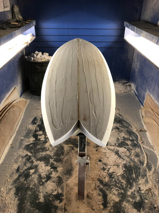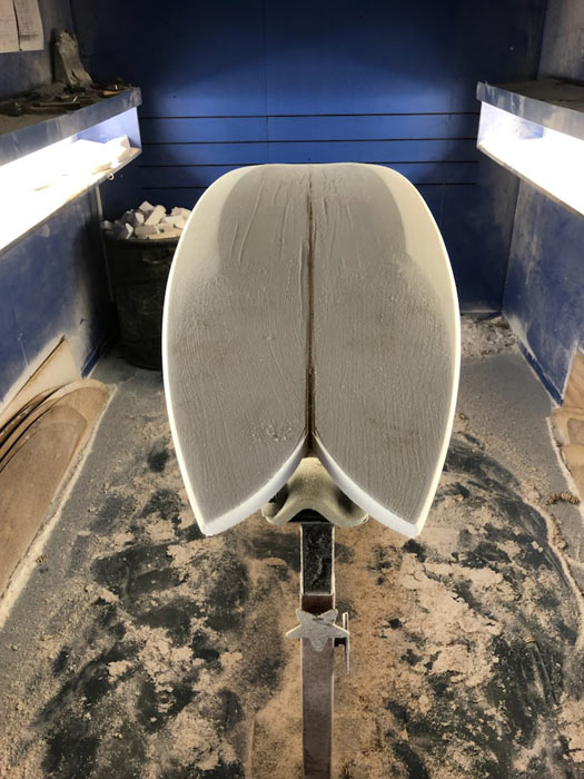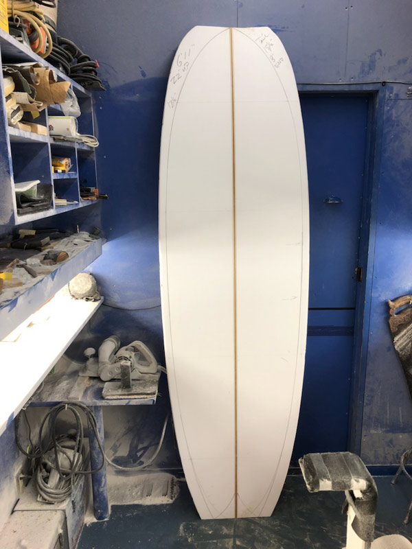 Tバンドストリンガーでというリクエストでご注文いただいていた、6’11”のプリモフィッシュ。ストリンガーが到着して、シェイプが始まりました。幅広めにということで、22インチから1/2インチ広くしました。