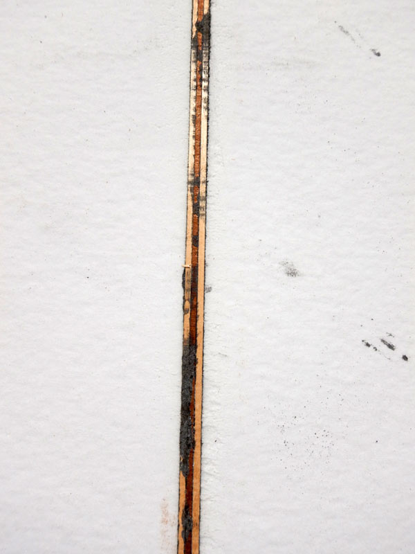 1/8インチのダークウッドを1/8インチのバスウッドでサンドィッチしたので3/8インチ、約1センチ幅のストリンガーです。グルーラインの接着剤がはみ出して汚れてますが、シェイプするとキリっと黒いラインが際立ちます。