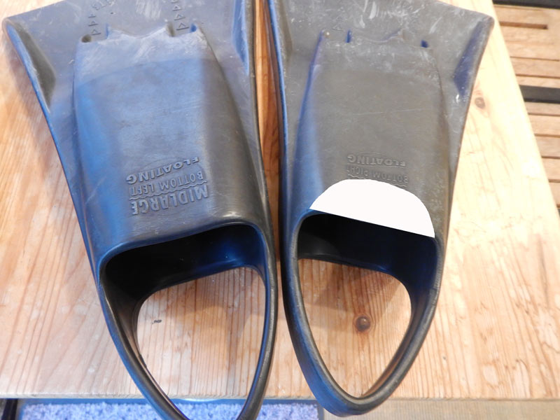 もうひとつ思ったのは足ヒレ本体のこと。足を入れると、どうしてもカカト辺りまで固定されたようになってしまいますが、一番端の部分を少し切って土踏まずの部分を動かせる(曲げられる)ようにしたら、もう少し脚と足が解放されるんじゃないかと考えています。画像の白く塗った部分です。
