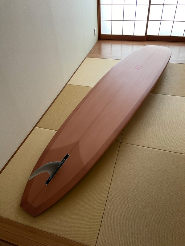 コンセプトはロングボードが70年代に続いていたら…です。60年代の終盤、ロングボードの時代が終わってボードはどんどん短くなっていった時代を活さんはリアルタイムで経験していますが、その後にやってきた素晴らしい時代、シングルフィンのショートボードの時代にもしロングボードを作っていたらこんな風になったんじゃない~?、というのがこのtotoのコンセプトです。