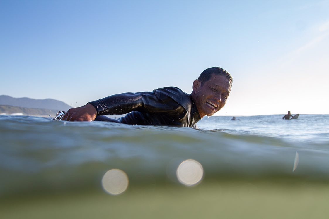 テイクオフといよりはおそらく、フィンの使い方なんじゃないかと思います。身長5’6”の私が、5’6”のボードでパドルをすると、ヒザ下しかボードの外に出ません。