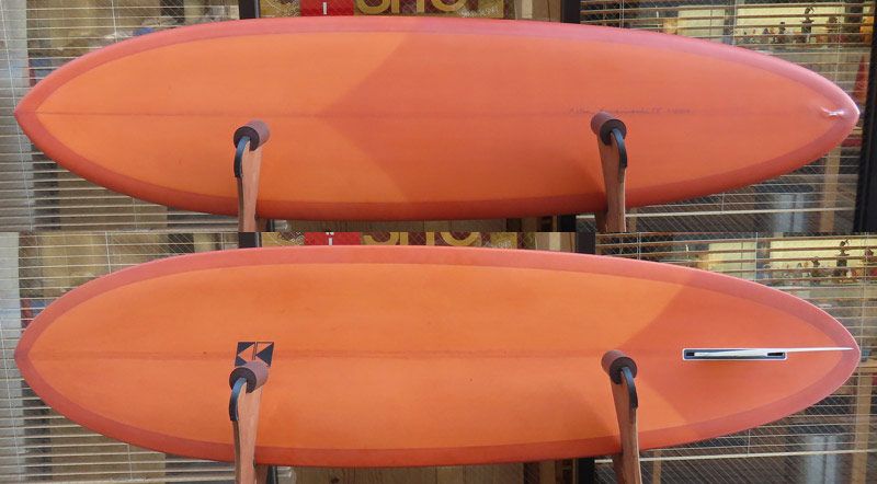 5’10”のKK FISH。もう一本のストックボードの5’8”と比べると2インチのレングスの差以上に感じるのが、そのボリューム感です。それぞれに使用しているブランクスの特徴を活かしてシェイプした結果の差です。