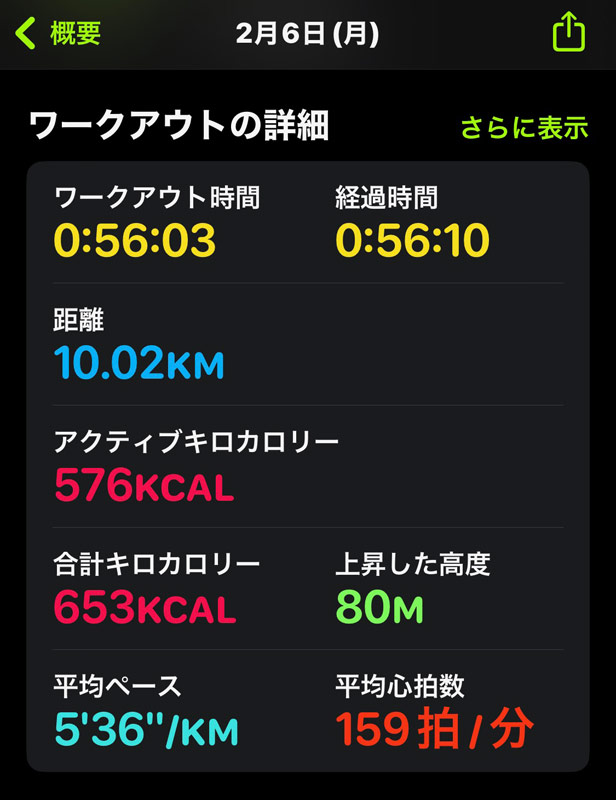 今朝はゆっくり目で良いので、10キロくらい走りたいと考えて走り出しました。苦しくなく、自然と手足が動くペースを意識して走ってみたら、こんな感じでした。10キロ/56分、キロ5分30秒くらいです。