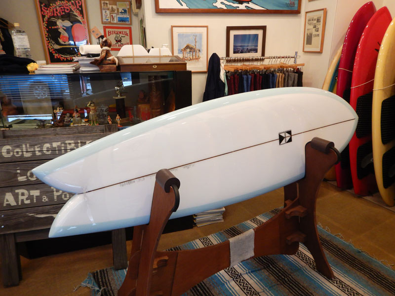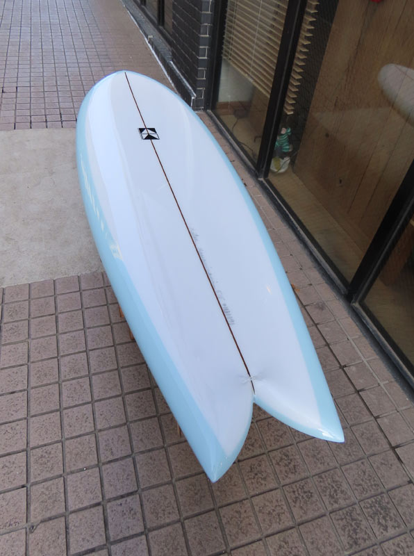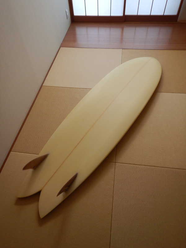 店置きのプリモフィッシュが出来上がりました。レングスは6’10”です。カラーも完璧で、イメージした通りの仕上がりです。活さんのシェイプが100%活きるのは、このラミネートがあってこそ。