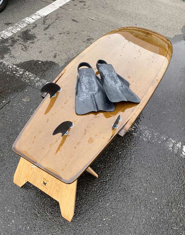 KK FISH 5’10”はストックボードです。ダークウッドストリンガーのチャージはサービス。ラウンドノーズ、テイクオフ速いですよ。