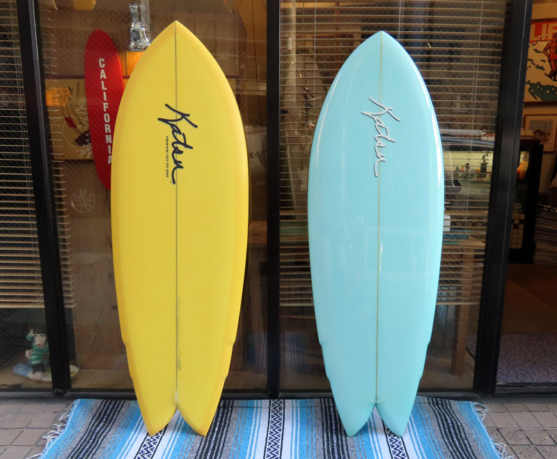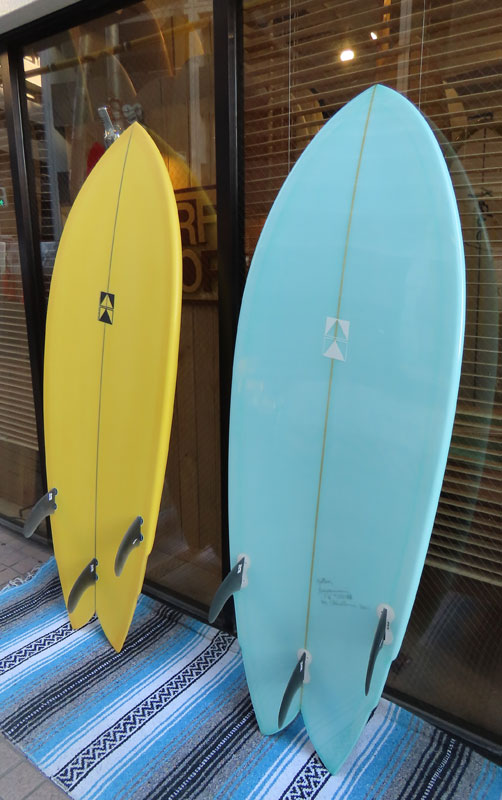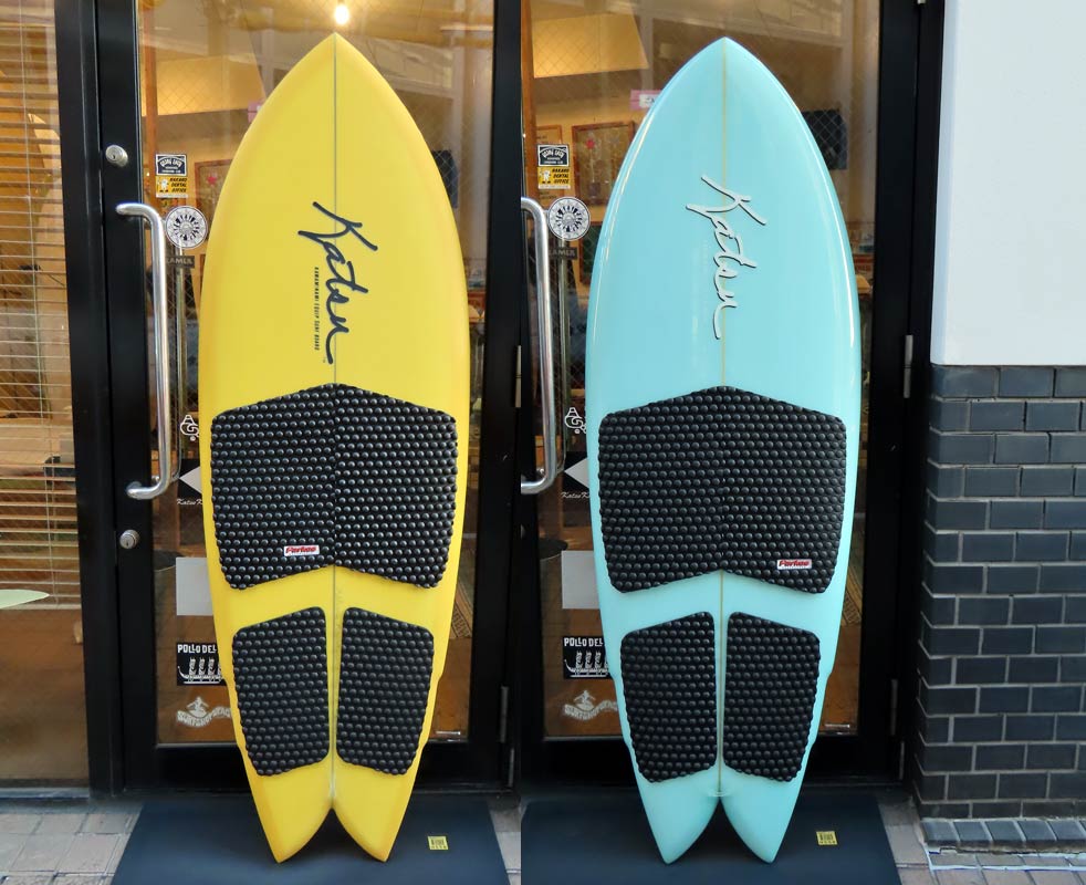 昨日のブログに登場した二本のボード。お分かりと思いますがニーボードです。イエローの方が5’7”で、ブルーは5’6”。ダブルウィングのフィッシュテールです。