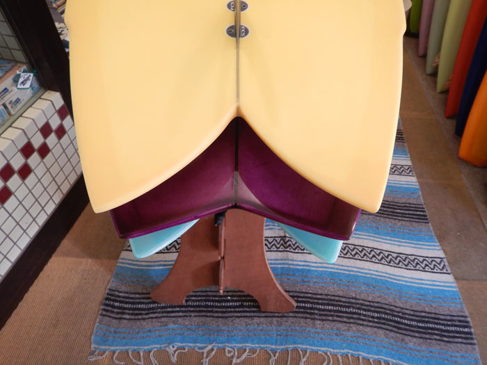 こうやって見ると、テールのフォームの量がスワローテールとかなり違うのが良く分かります。テールまでのアウトラインはパープルの5’7”とほぼ同じです。フィッシュテールはテールの抜けが良く、テールの先端がそれぞれはっきりとしているのでターンへ入る反応は敏感になりそうです。