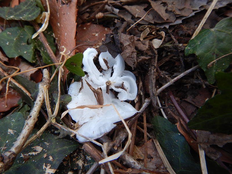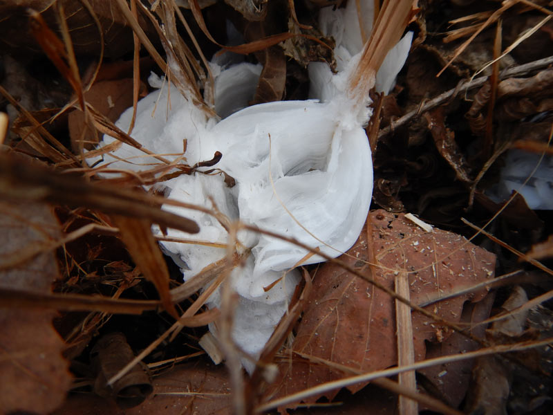 シモバシラという植物です。冬は枯れるのですが、枯れた茎に残っている導管が吸い上げた水が凍ってこんな風に氷の華を作り出します。寒いですが綺麗なものです。