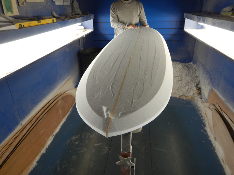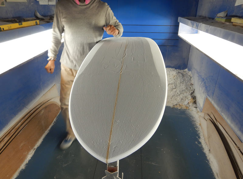 デッキ側からもレールを落とします。シェイパーからすれば当たり前なんでしょうけど、ガイドも無いのに良くきれいな面が、しかも左右ほぼ同じ角度で削れてしまうものだと思います。