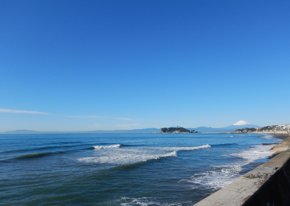 富士山はすっかり雪化粧です。インサイドでコシくらいですが、しっかりとセットが入ってくるのです。ずっと波があるせいか人も少ない。