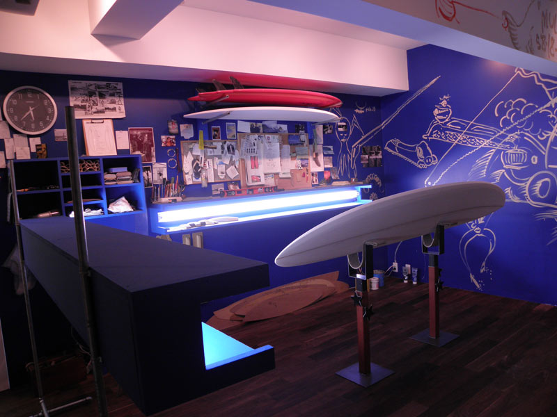 ショップのオープンは2001年。それ以来、ロングボードをベースに、フィッシュ、ボンザー、シングルフィン、ニーボード、パイポとさまざまな種類のサーフボードを作り、試してきました。