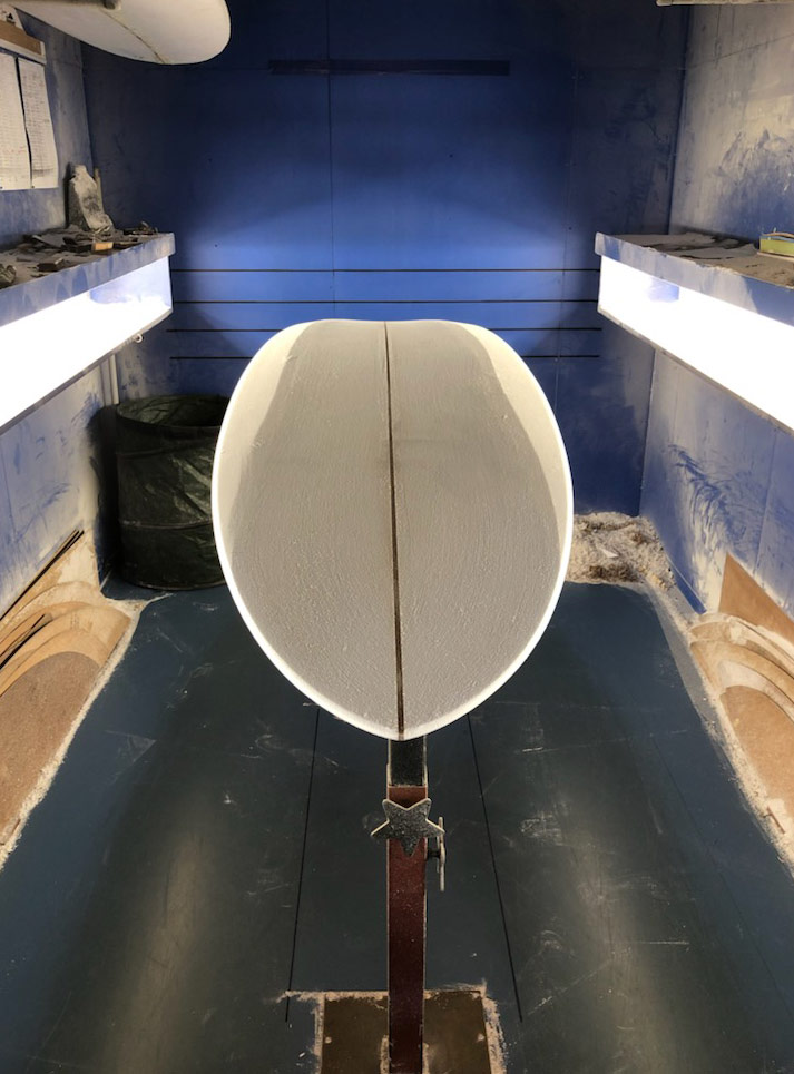 活さんはTIKIのオーダーボードをシェイプ中です。TIKIは小さなサイドフィンがついた、シングルスタビライザーと呼ばれるフィンのセットアップが特徴です。