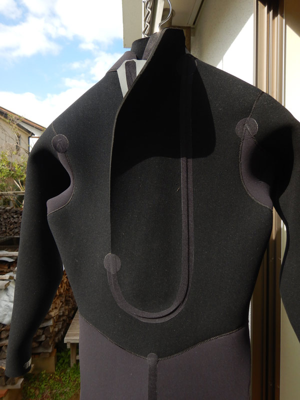 背中のジッパー部分をカバーしてジッパーから浸みこんでくる海水を直接肌に触れないように、身体と外部とを仕切っています。上部は首にかけて首回りからの浸水、特に首の後ろからの浸水を防いでくれます。