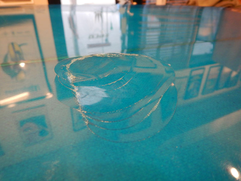 話は変わってリペアです。画像は活さんのホットマンゴーのボトム。ヒザが当たったか?そういう形状のものが当たってヘコミとクロスを割ってしまいました。