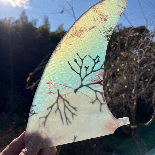 サイドフィンは形状と取り付け方で目的とするものが変わってきますが、TIKIのシングルスタビの場合はトライフィンと同じ理屈、ボトムからは波のトップ方向へ上がる動き、波のショルダーからはカール方向へ戻る動き、つまりカットバックのときのターンをサポートするように機能します。